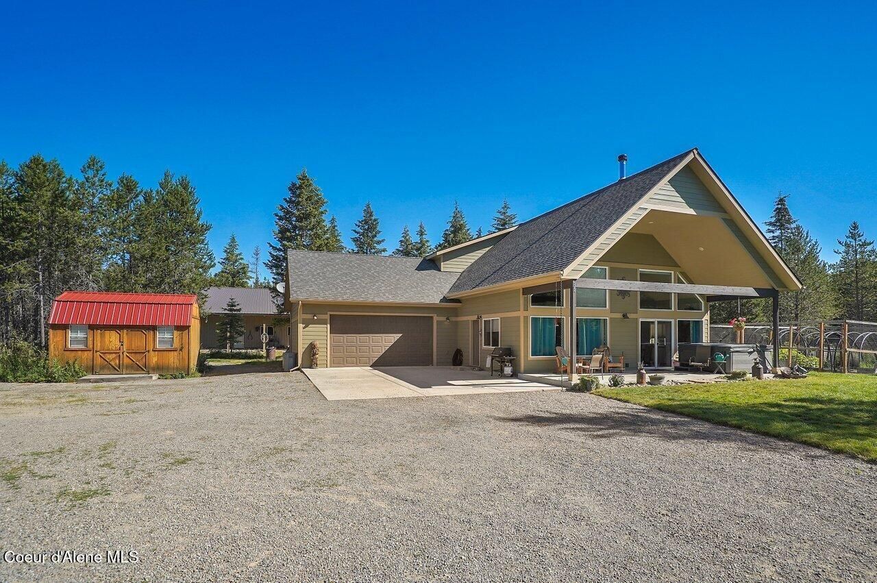 Enjoy peaceful, private living on 10 treed acres at the end of a no-through road. This home features an open kitchen with large peninsula, breakfast bar, walk in pantry, and dining nook. Vaulted ceilings and expansive windows fill the living area with natural light. Main floor offers laminate flooring, laundry area, two bedrooms, and a full bath. Upstairs, the primary suite includes a walk-in closet, dual vanities, tiled shower, and loft overlooking the living space. Property includes a storage shed and a 32' x 38' insulated shop with concrete floors, two 12' x 38' lean-tos, and a private bathroom. Convenient location near shopping and minutes to Farragut State Park for year-round recreation.